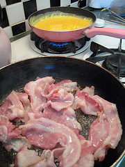 Provided you don’t include the baked potatoes and baked beans, this English and American classic can be enjoy without feeling bad. Choose organic free range eggs and nitrite and sugar free bacon coming from a humanly raised pork and don’t be scared to eat this delicious lard! I like to cook my bacon beforehand, then cooking my eggs in the bacon fat that’s in the pan. That makes for a proper breakfast!