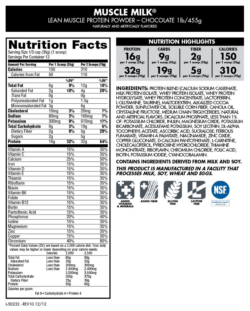Just for example, take a look at what you’re getting in a jar of chocolate Muscle Milk (32 grams of protein per 2-scoop serving):